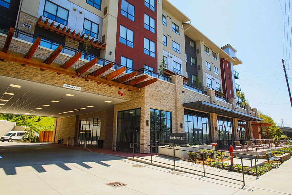 This beautiful new Residence Inn in Renton, Washington, is another one of our “Jobs of the Week.” Situated on a large hillside, this new hotel consists of two levels of parking garage and lobby under a concrete podium deck, with four floors of guest rooms above. It’s owned by our long-time client, Western International, out of Dallas, Texas. We’ve been working with Western since 2001 on over 60 hotels, and are grateful to be part of their team.